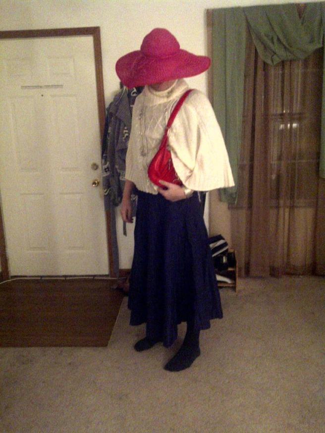 We are invited to a Halloween party today. N decided to dress as a woman because this allows him to wear my long blue skirt and my pink hat that he adores. And I, of course, had to dress like a man.
