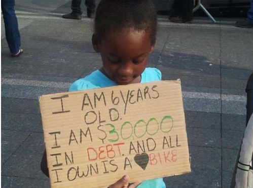 I’ve been staring at this photo for two days but I honestly don’t get it. How can a child be in debt? Do banks lend money to small children? Can anybody explain?