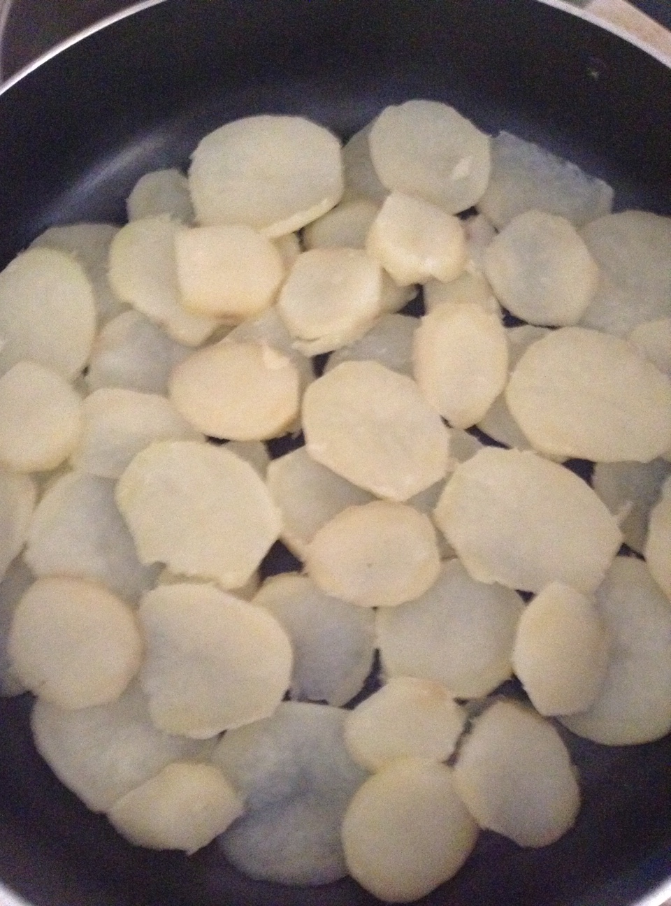 1. Normally, the first layer in the casserole should be onions. I can’t be in the same room with cooked onions, though, so I use potatoes instead. Potatoes should be pre-boiled to the point where they are still about halfway cooked. Then you cover the bottom of the casserole with potato slices: