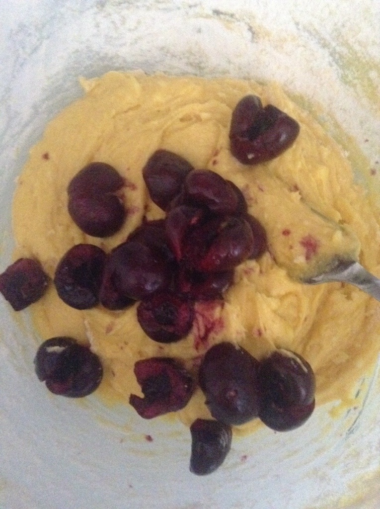 3. Add half a teaspoon of baking powder and mix everything up. Now slowly add about 2 cups of flour, mixing it in very well. Take some pitted cherries (or any other kind of berries you have) and mix them gently into the batter. Place the batter in a buttered baking dish: