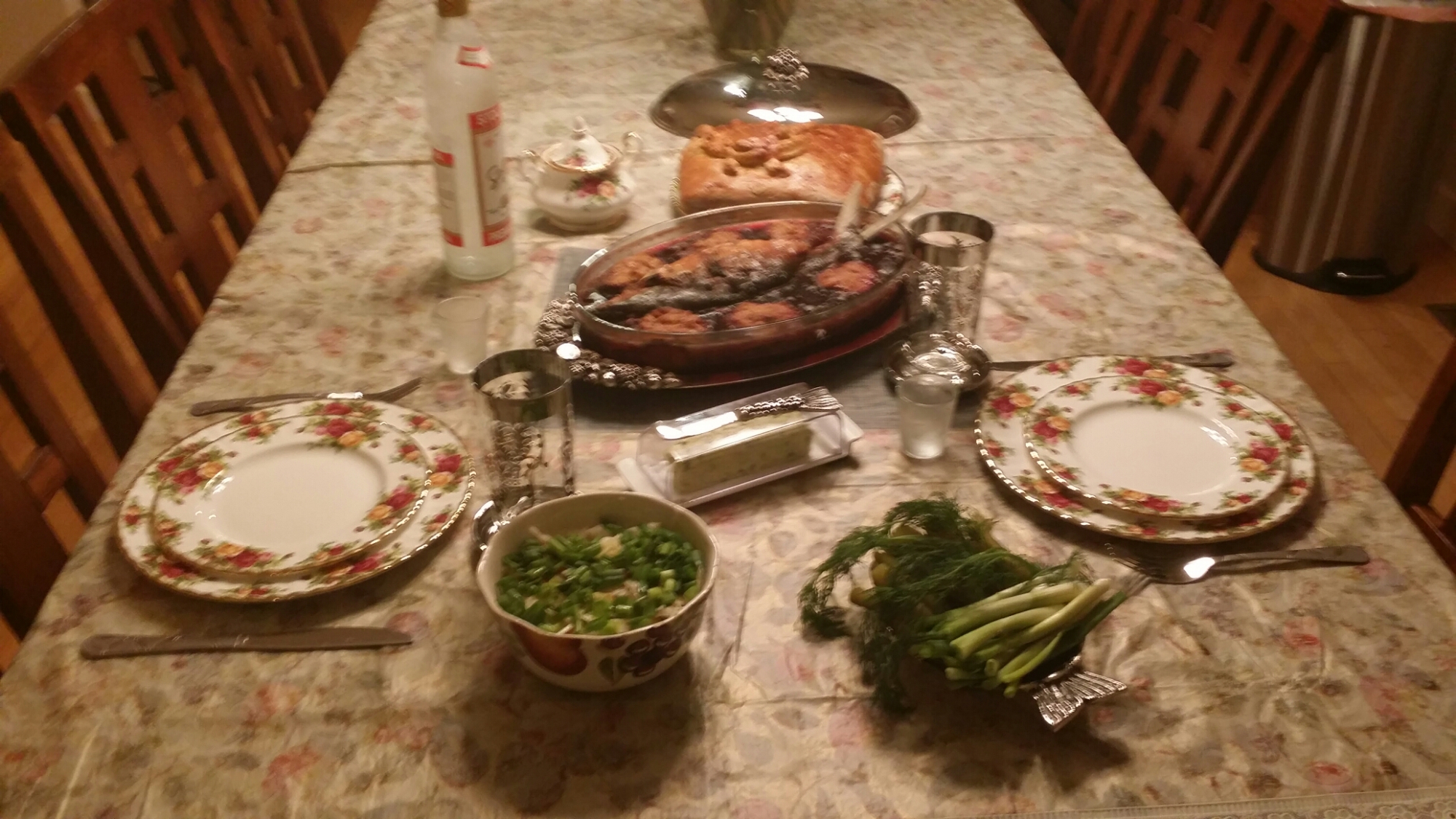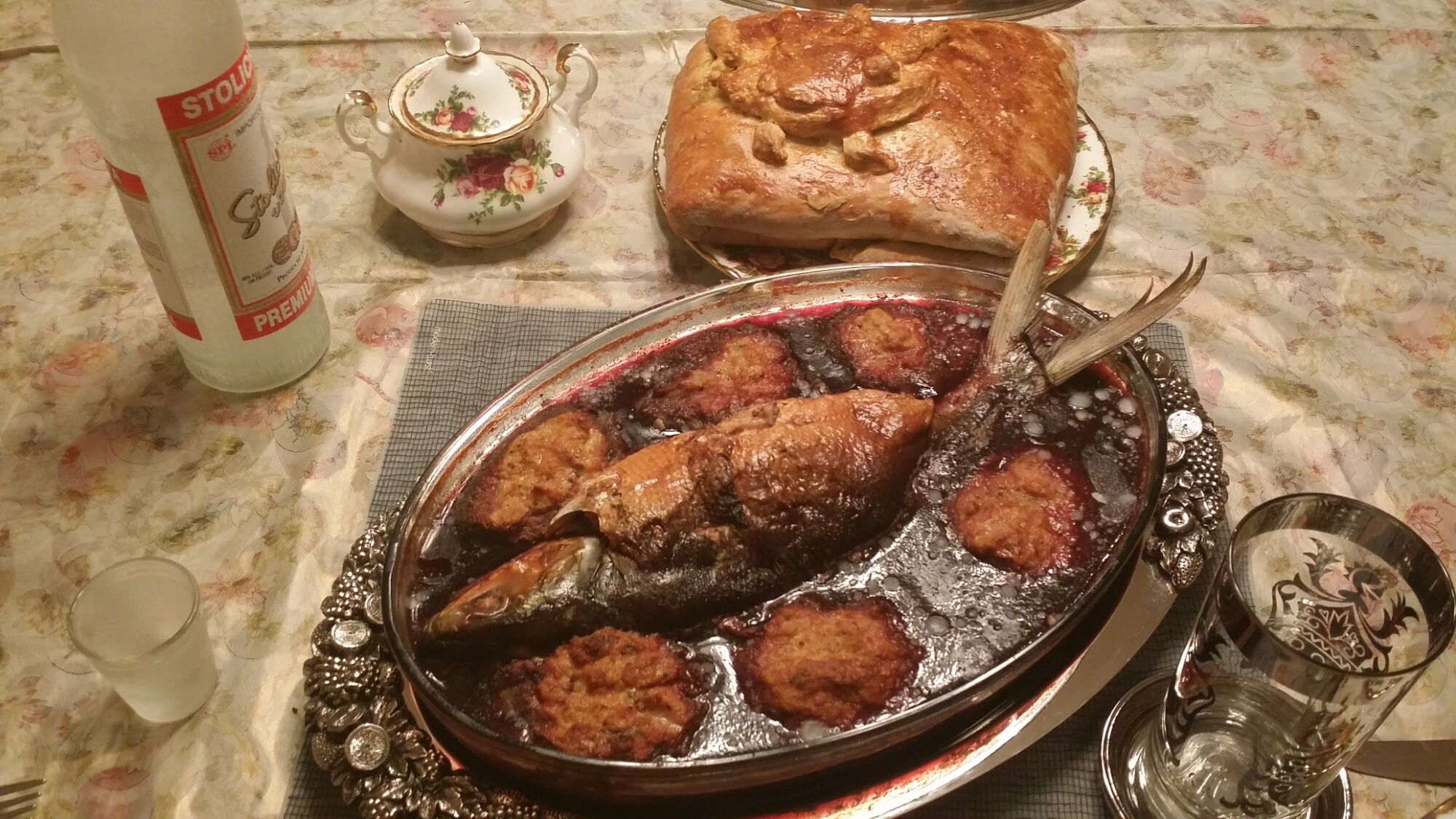 I did the gefilte fish the Ukrainian way instead of the Polish recipe I had used before. The Ukrainian version has no sugar added, and the sweetness is achieved through the use of beets. Which is why the whole thing is so red: