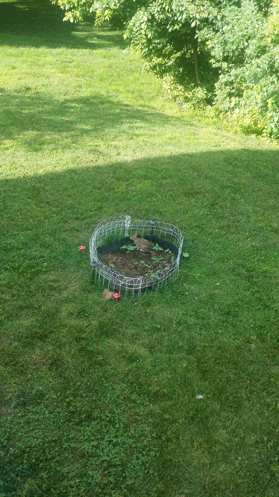 I approached the enclosure and clapped my hands. The rabbit tried to get out and got stuck in the netting: