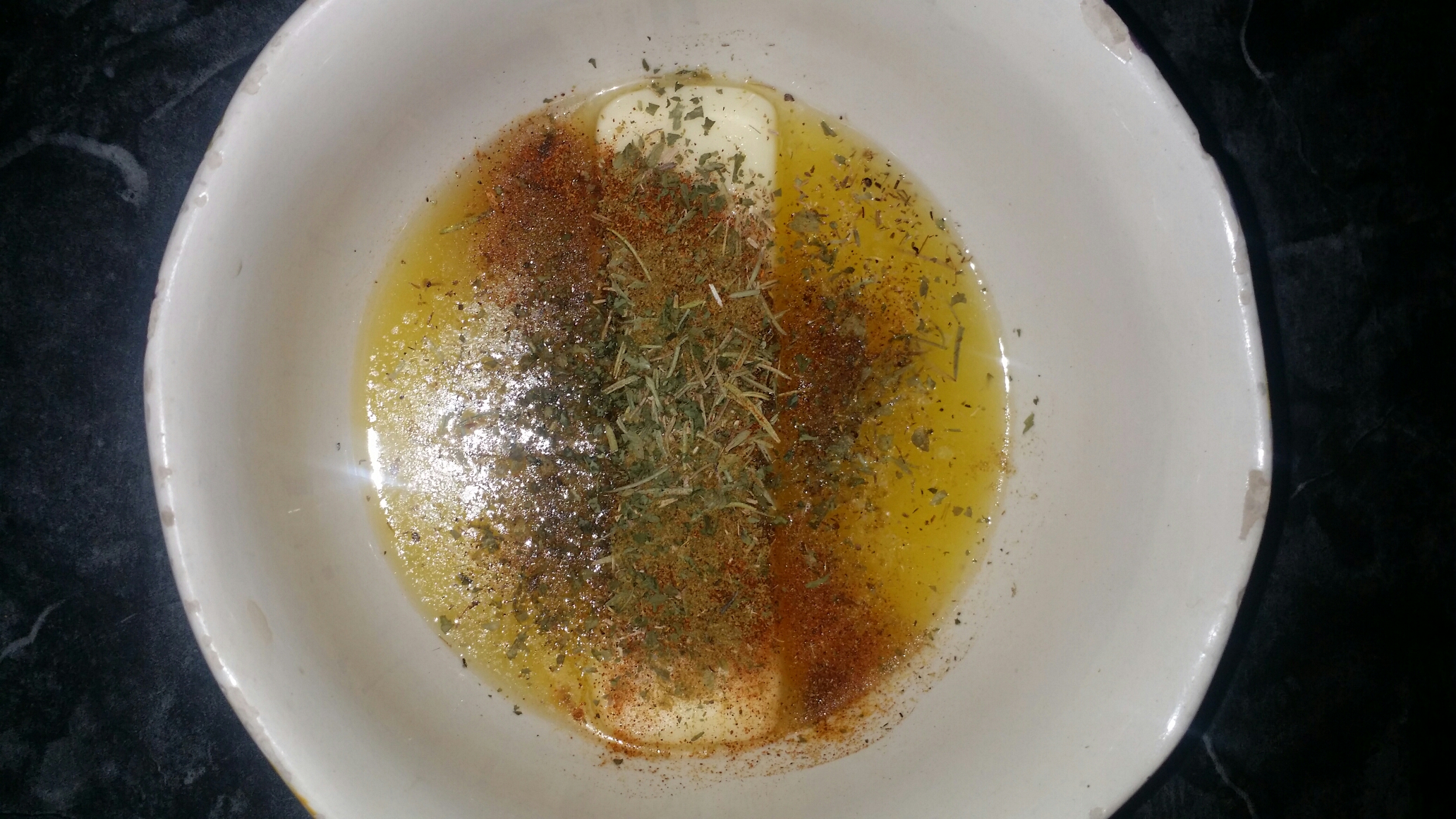 Then you have to melt some butter (yes, good wife titles are rarely arrived at by way of green salads) and mix in salt, some crushed garlic, a bit of paprika, and any herbs you happen to like: