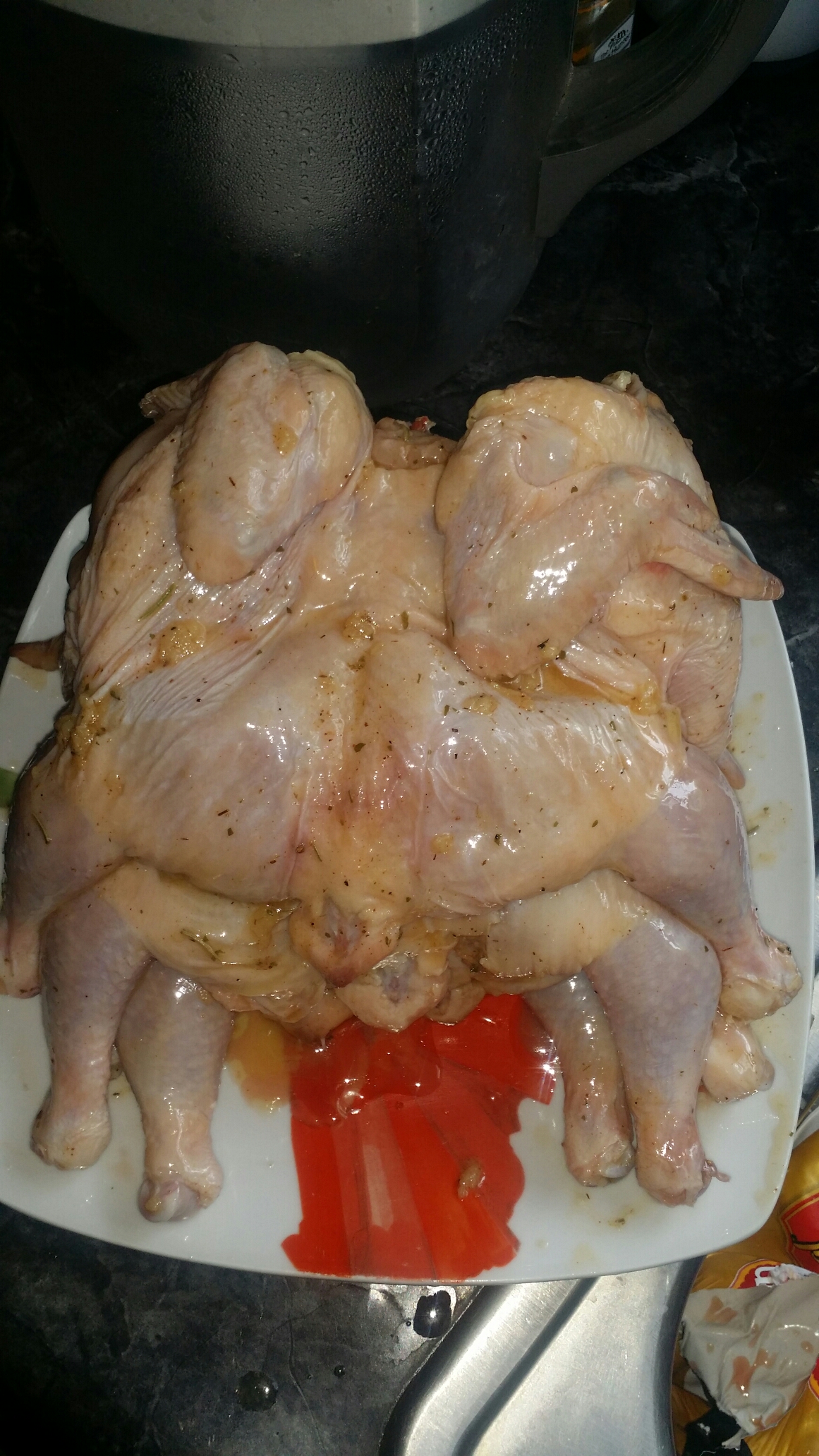 The first step is to split the hen in the middle on one side, so that it looks kind of splayed, like this: