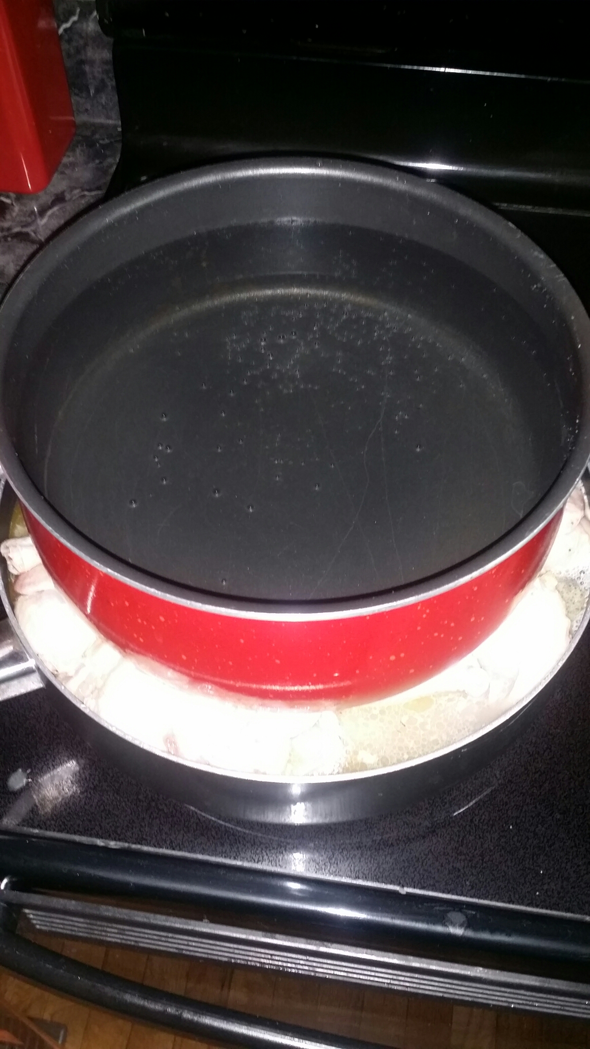 Now we pack the hens into the pan. If they don’t fit, it’s OK to put them belly to belly in pairs. Then we add some water to the pan. The hens should never be immersed but the water should cover the bottom of the pan fully. And now, the most important thing. We take a big pan with a very clean bottom, fill it with cold tap water, and place it on top of our tabacky chicken:
