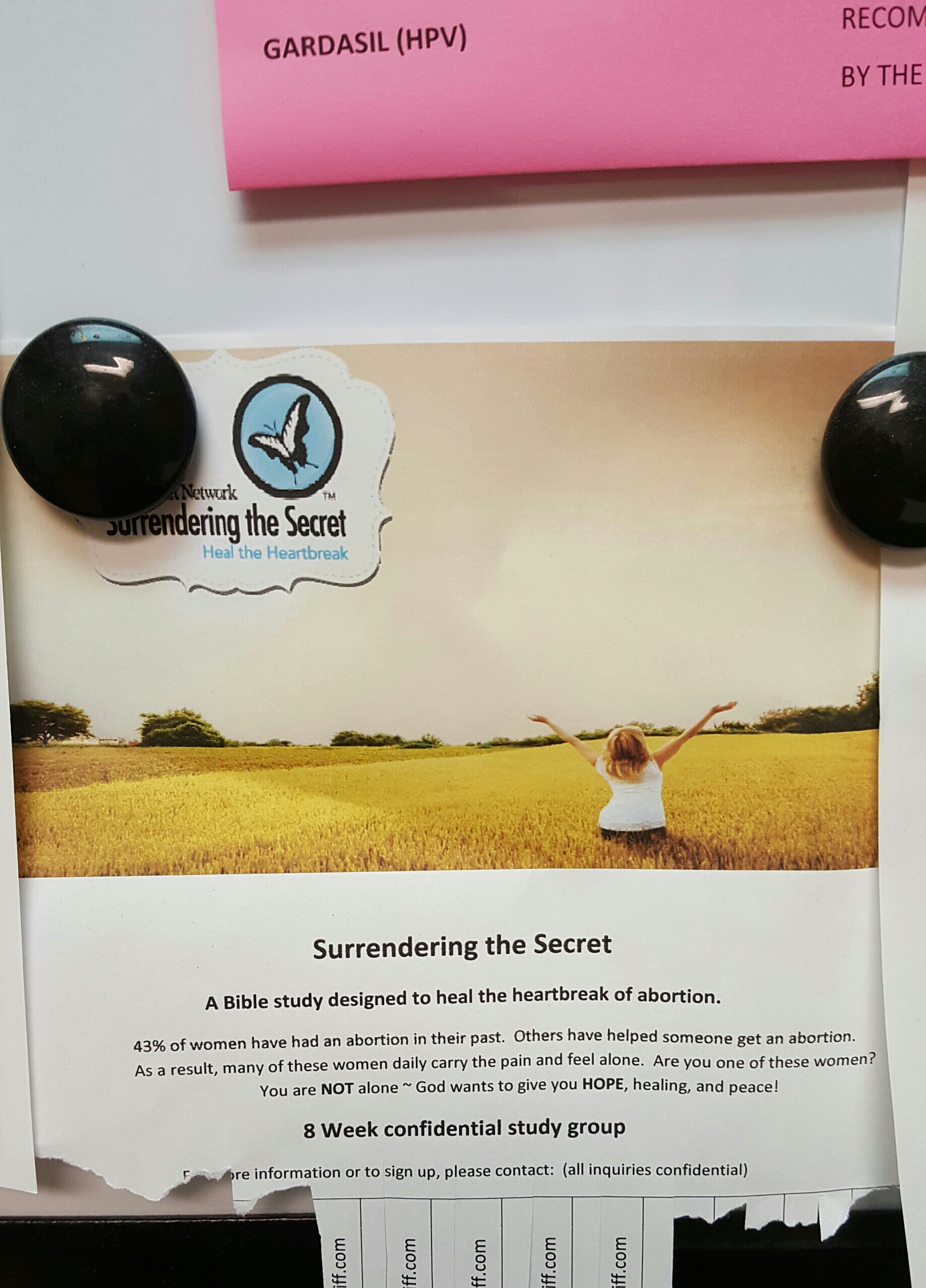 So everyone was all like “Go to a different OB-GYN, go to somebody less religious.” So I did. And here is what the new OB-GYN came up with to make patients feel totally not judged for having aborted. Just in case you are not entirely sure how your doctor feels about your reproductive choices, lift up your eyes as you are laying on the examination table, and encounter this, you dirty whore.