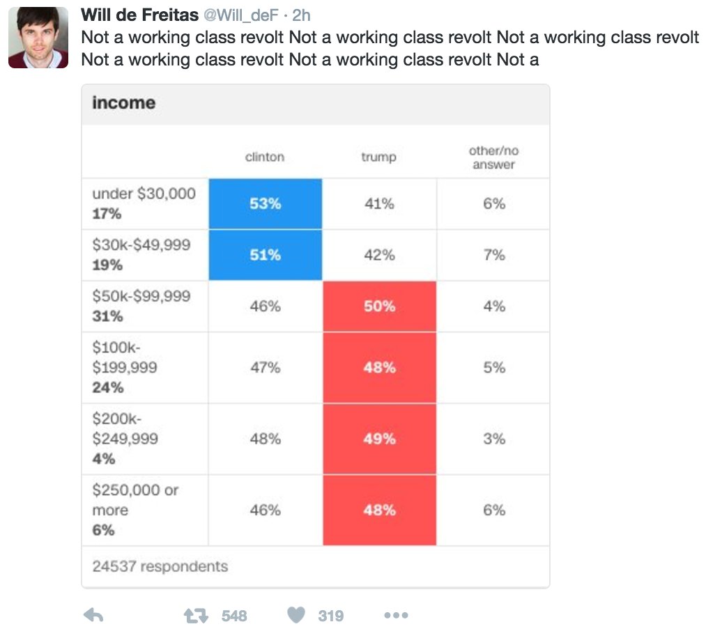 1. This doesn’t say a whole lot if you don’t also include the relative change from 2012. For people making under 30k, there was a 16pt swing towards trump. That’s significant, no?