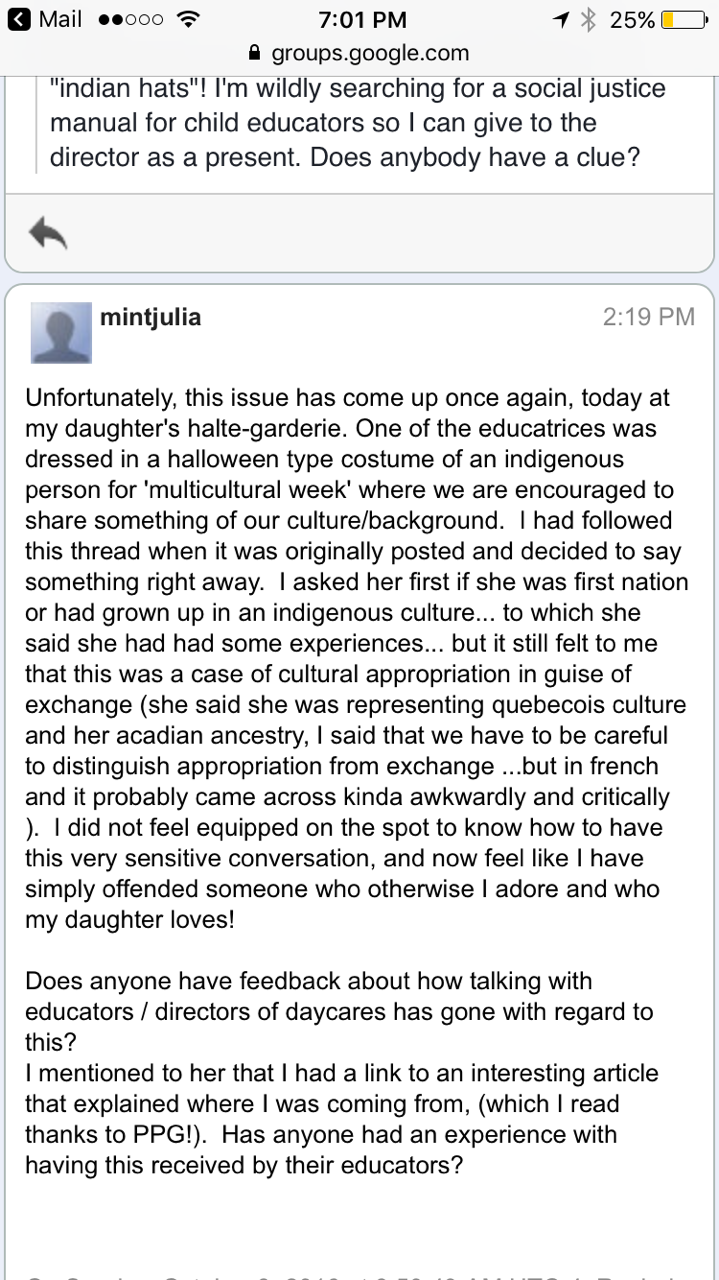 There is probably a line somewhere that crosses into cultural appropriation, but I think it’s fairly far from wearing a costume that vaguely resembles a native American dress for multicultural week.