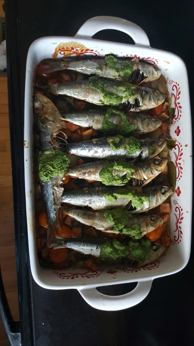 I took the dish out and placed the scaled, gutted sardines on the vegetables and spread some of the spicy green sauce from the Indian restaurant on them. 20 minutes later, the dish was done: