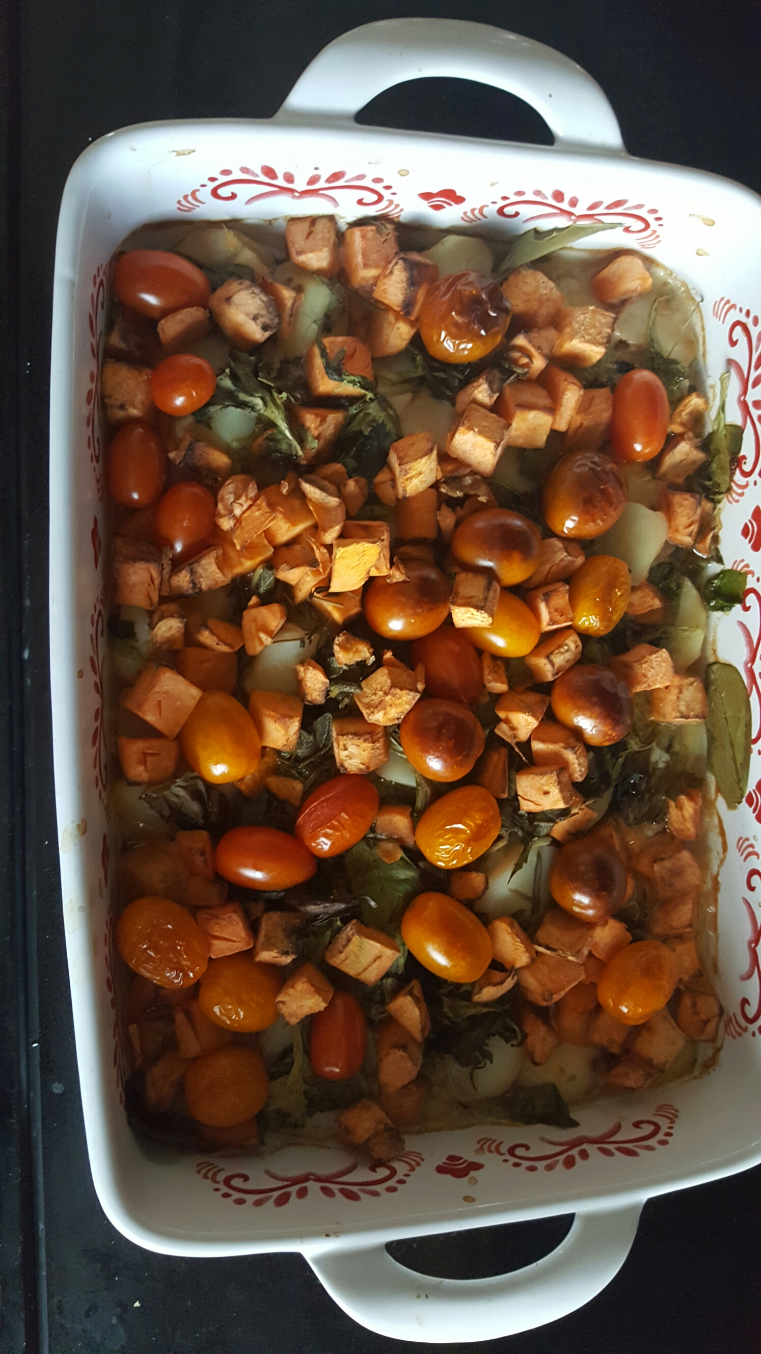 First, I put some sweet potatoes, cherry tomatoes and spring greens in a baking dish and added some fresh rosemary and oregano.