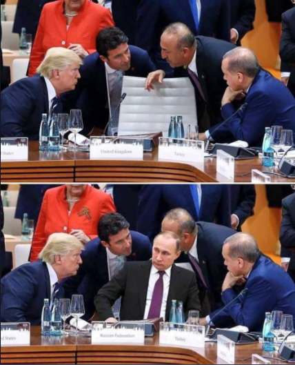 Russian state propaganda has photoshopped Putin into an empty chair to make it look as if world leaders huddled around him for instructions.