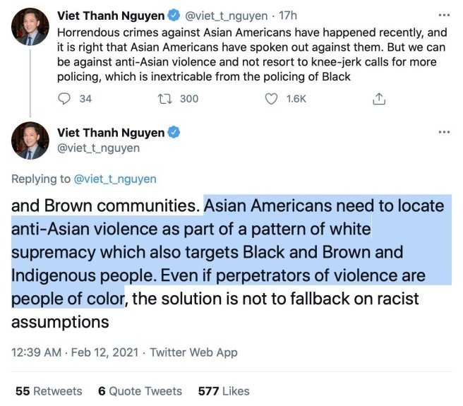The irony is that his family are refugees from a country that was colonized and ruthlessly exploited by the Chinese for over 900 years and suffered terrible crimes against humanity during the Japanese occupation. But somehow only white violence is truly “systemic”. You can’t make this nonsense up…