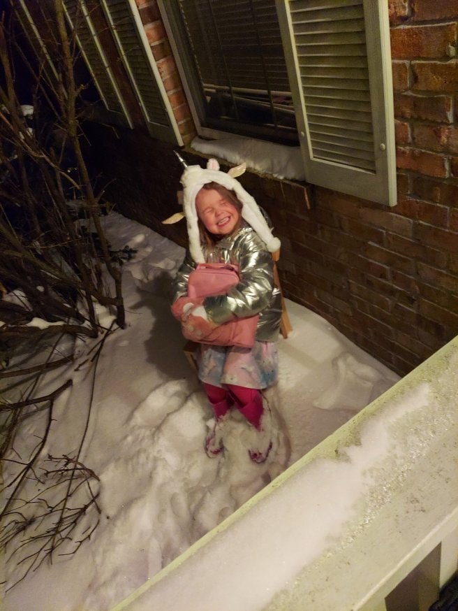 As I was having dinner, Klara got dressed, packed a bag, grabbed a chair, placed it into a snow mound under the window, and sat down.