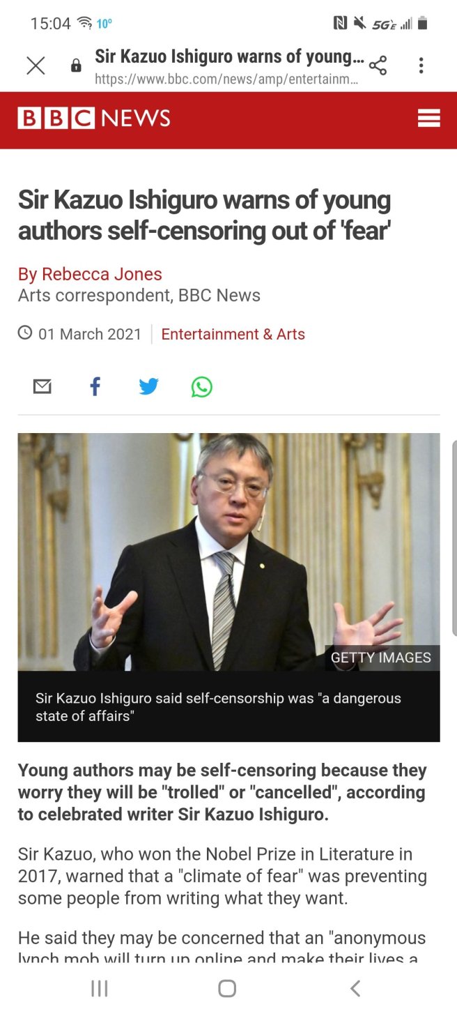 Ishiguro’s success depended on the consent of the literary establishment, particularly awards committees and critics. By now he’s so successful that it doesn’t really matter what he does. However, to his point, any writer who wants to write ‘literary’ fiction has to conform to the whims of the woke mob. Of course, ‘literary’ writers can rarely support themselves through readership alone, relying on college appointments that involve perhaps even more thorough conformity, grants, and awards.