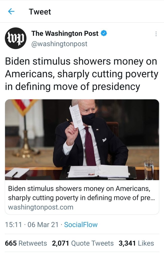 1. LOL “showers money” and “sharply cuts poverty” with a one-time $1,400 per person infusion after a year of lockdown. This bombastic word choice would make sense only with two more zeros on each check.