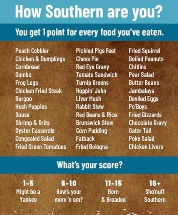 Cheese-grits and fried okra also conspicuously missing… and thought poke was more of an Appalachian taste?