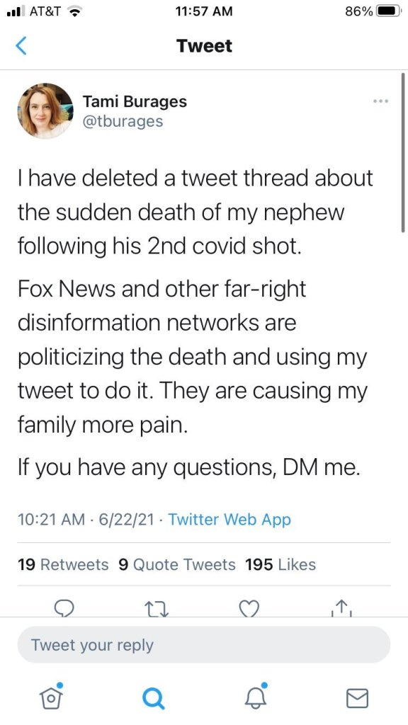 1. I guess another possibility is that she was lying in hopes of “trapping the anti-vaxxers” into sharing the story as if it was gospel so she could pull a GOTCHA! on anyone who believed her. Instead people started questioning her story almost immediately and instead of coming clean she doubled down until she realized it was going to be personally hazardous for her to continue the charade.