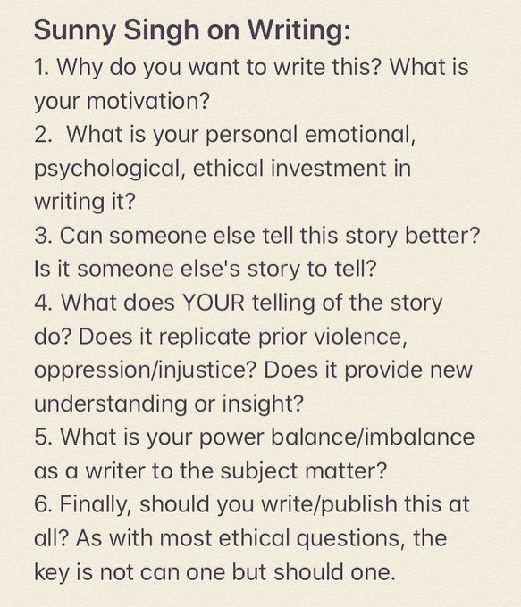 This Sunny Singh is a college professor and an obscure writer of fiction. I came across the list because I saw a group of aspiring writers online share it eagerly like some important piece of wisdom. Of course, they are only motivated to follow these precepts by the fear of cancellation by a bunch of envious, angry Sunnys. It won’t work because subservience never mollifies rabid mobs. But the result is mountains of boring, terrified, indigestible writing.