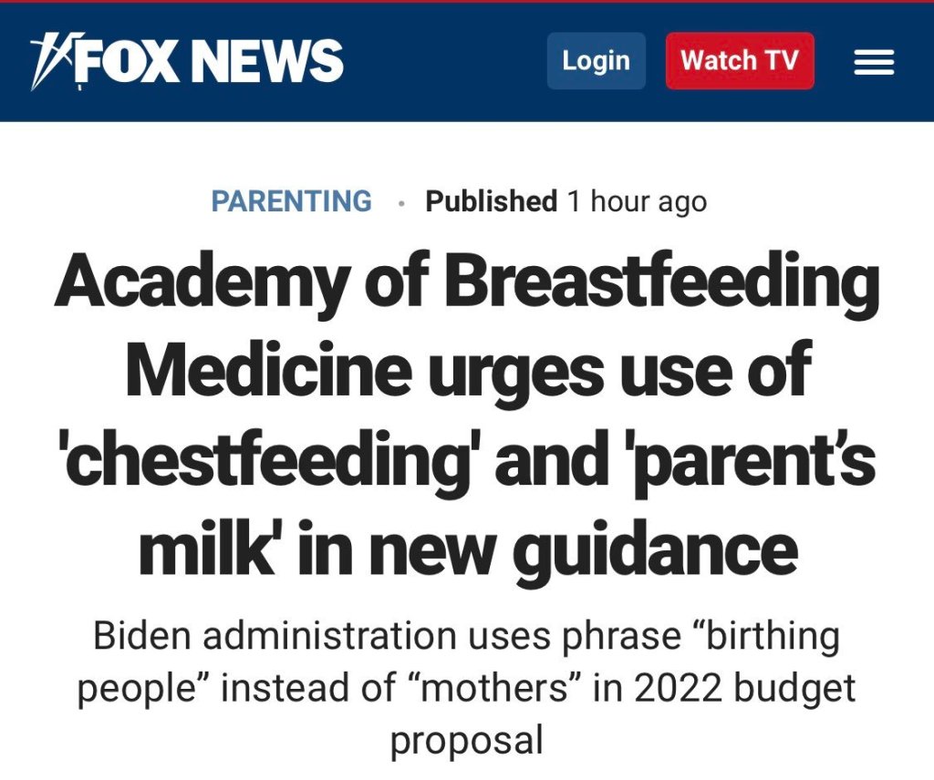 2. Why “chestfeeding”? What is so exclusionary about breasts? Even men have breasts. They generally aren’t enlarged in men, but men have them, there are nipples, and there are even underdeveloped mammary glands. Men even get cancer in them sometimes. Breasts are organs that humans have and referencing them in regard to their function of providing milk should not be controversial. In fact, implying that transmen don’t have breasts would imply that transmen aren’t even mammals.