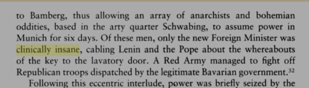 Also, Burleigh tells of the brief existence of the Bavarian Soviet Republic. It started experiencing milk shortages immediately, and the progressive authorities needed to come up with a narrative to justify it. “The only people who drink milk are bourgeois children!” they proclaimed. “And if they die, that’s a good thing. They will only grow up to oppress the working classes, so what’s the problem with them dying off now?”