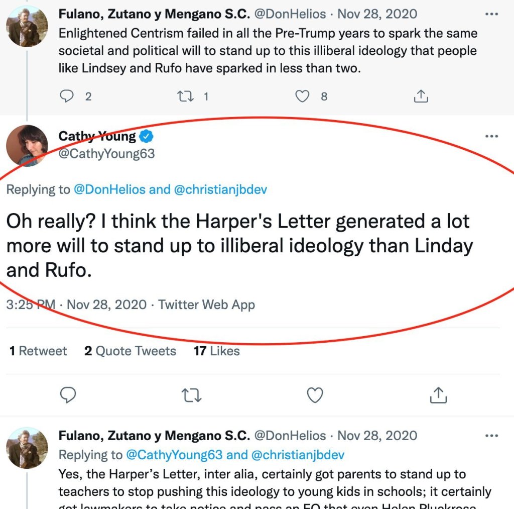 (For the non-US readers, Chris Rufo organized parents to stand up against indoctrination in schools, delivering a victory for Republicans in the Virginia governor election. Cathy Young signed a letter with a bunch of other people mildly squeaking something vague about illiberal ideology. Now she thinks that the results Rufo achieved are due to her single little squawk. Truly, many people have no perspective at all. And if you aren’t subscribed to Chris Rufo’s newsletter, please do. If nothing else, the guy is a study in relentless, hardworking, steely determination.)