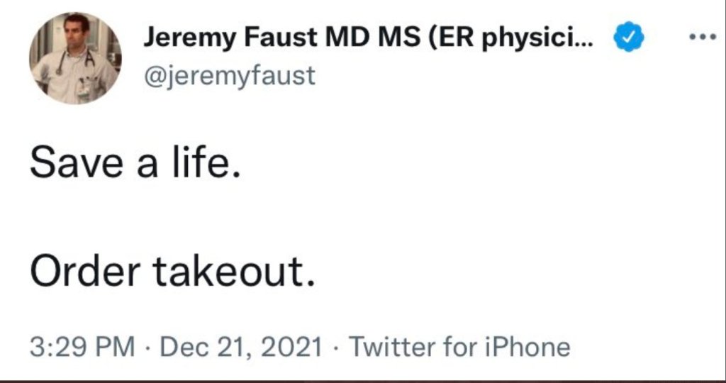 Mr MD MS ER physician either believes that takeout food is spontaneously generated in nature and flies to his house on wings or that cooks and delivery people are not human.