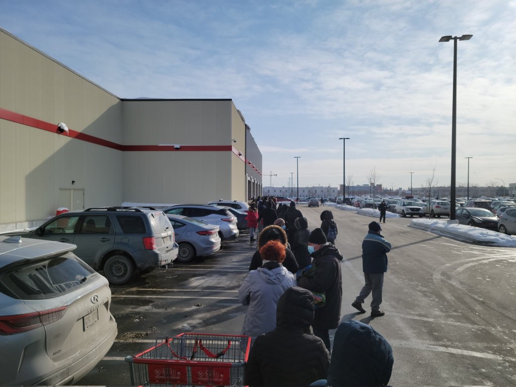 It’s -17Β°C in Anjou, Quebec. People are lining up in the cold to wait their turn to show proper documentation to enter the grocery store.