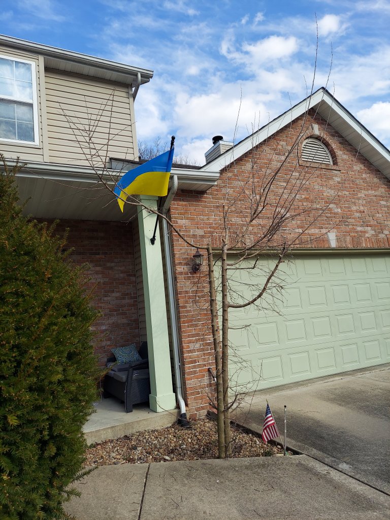 The Ukrainian flag my Russian husband put up on our house