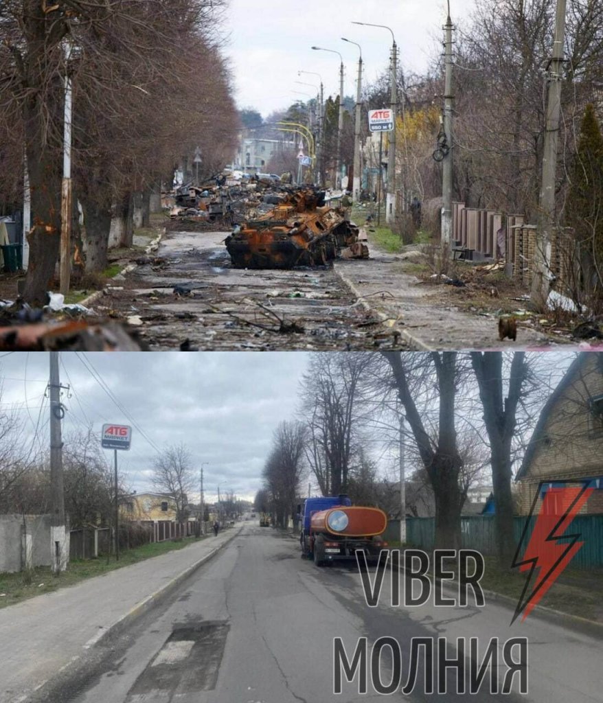 This is Bucha right after being liberated from the Russians and earlier today: