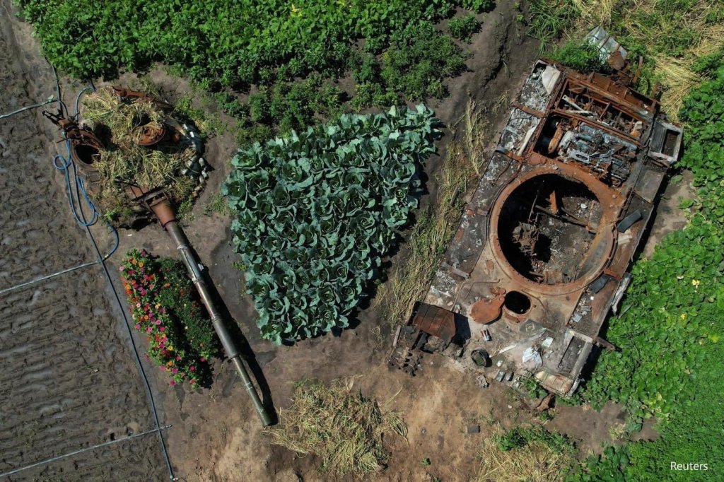 Valery, a Ukrainian farmer near Kyiv, reclaimed the plot of land where a Russian tank has died. He planted a vegetable patch around the tank and is using its body for a compost pit: