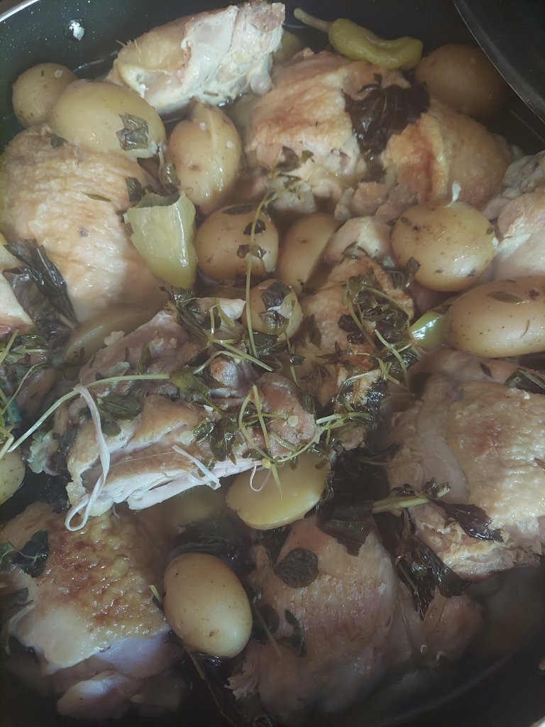 I’m looking for new ways of cooking chicken because everything else is so darn expensive. I found this recipe that sounded mega weird but it turned out nice. You take some preboiled baby potatoes and a jar of something called pepperoncini peppers. They have to be whole, not sliced. Toss the potatoes and the pepperoncinis in some olive oil, garlic and oregano. In the mean time, brown some chicken thighs in a pan on both sides for about 15 minutes. Then dump the potato/pepperoncini mix on top and spread it around. Pour the liquid from the jar around the sides of the pan. Close the lid and let it cook for 45 minutes.