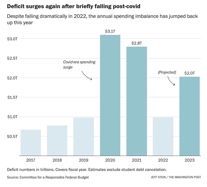 The deficit surged during COVID, then predictably went down in 2022. It was supposed to go down in 2023 because there’s no war, recession, pandemic or anything of the kind. Instead, it jumped up like crazy. It hasn’t reached the COVID levels but look how high it got.