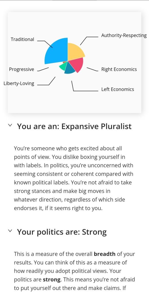 1. I also got expansive pluralist but couldn’t save the results. I tried to send them to my twitter but it’s just a link to the site and not the results. (note to makers of the test, this kind of thing is only fun if people can compare the relative percentages).