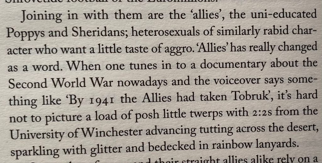 Incidentally, this is why I’m irritated when gay men want to act like everything was hunky dory within gay activism until 2015 or so when trans activism started really picking up steam. By all means, criticize the evils of that movement loudly and publicly. But don’t act like gay activism hasn’t been foul for the majority of its existence (it’s debatable whether there’s any point when this was not true.)