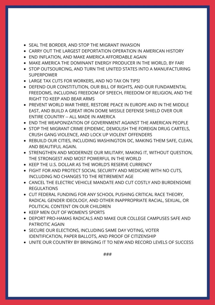 Observe also the grammar form used in every point on the list. Not a single one has an actual agent in it. Such as, for example, “I will sign an executive order barring the processing of asylum claims of people in the country illegally.” Or “I will organize and fund recall campaigns for soft-on-crime DAs.”