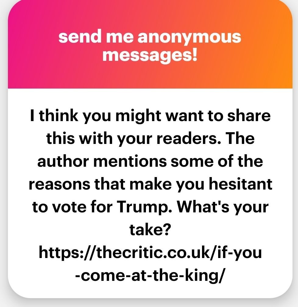 However, if he chooses a decent person as veep and not, for example, a pussy-wipped sub of a mega woke wife like JD Vance, I might consider voting for him. So I’m really looking forward to the announcement.