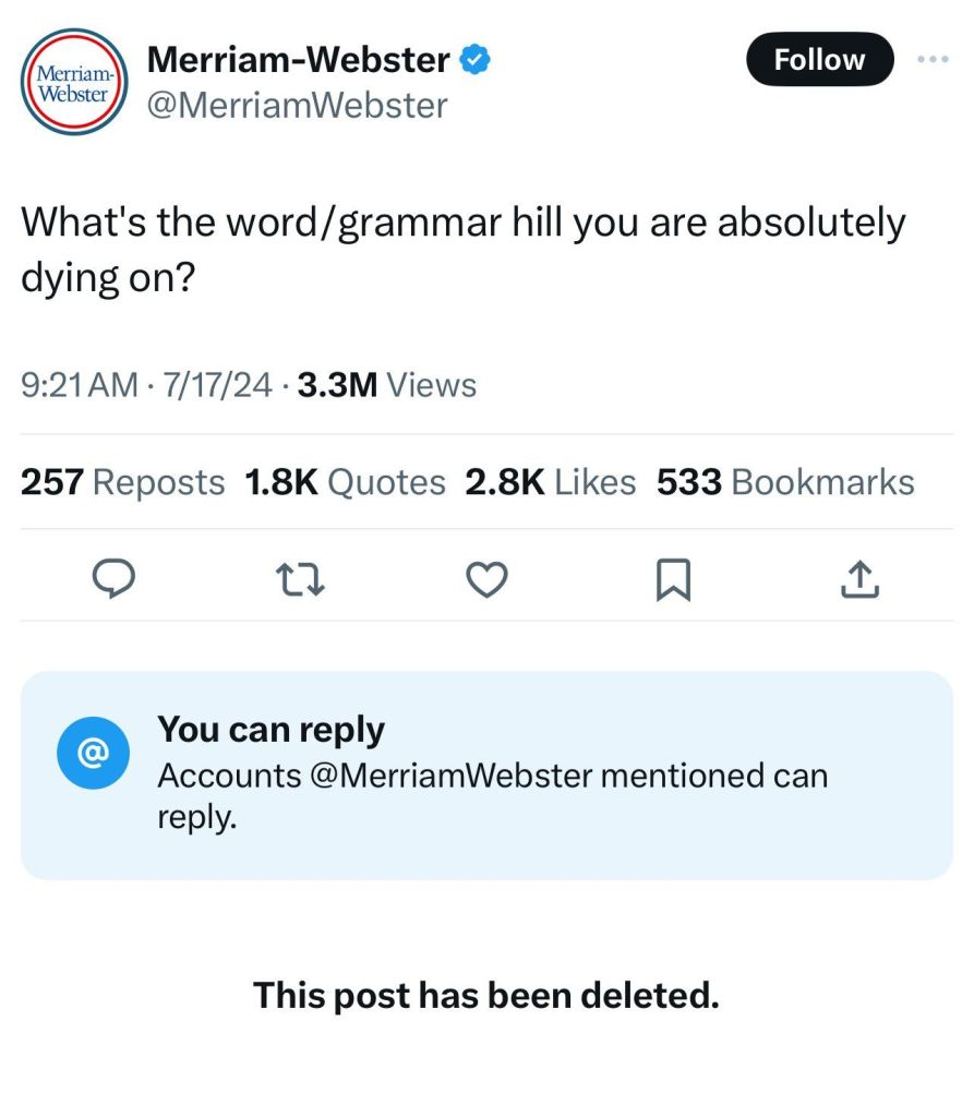 The Merriam-Webster dictionary had to delete replies to its popular post and then remove the post altogether.