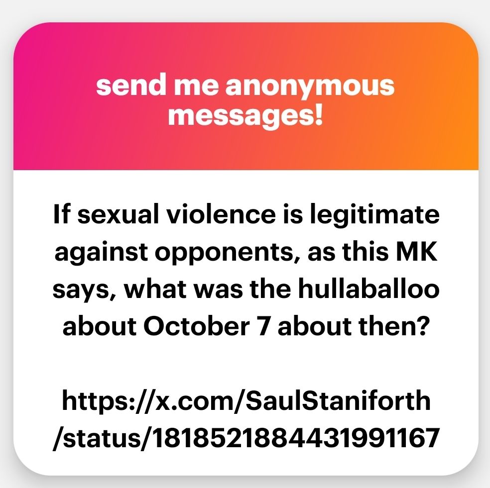 For those interested, this is what the Israeli MP says: that rape is a legitimate weapon against opponents.