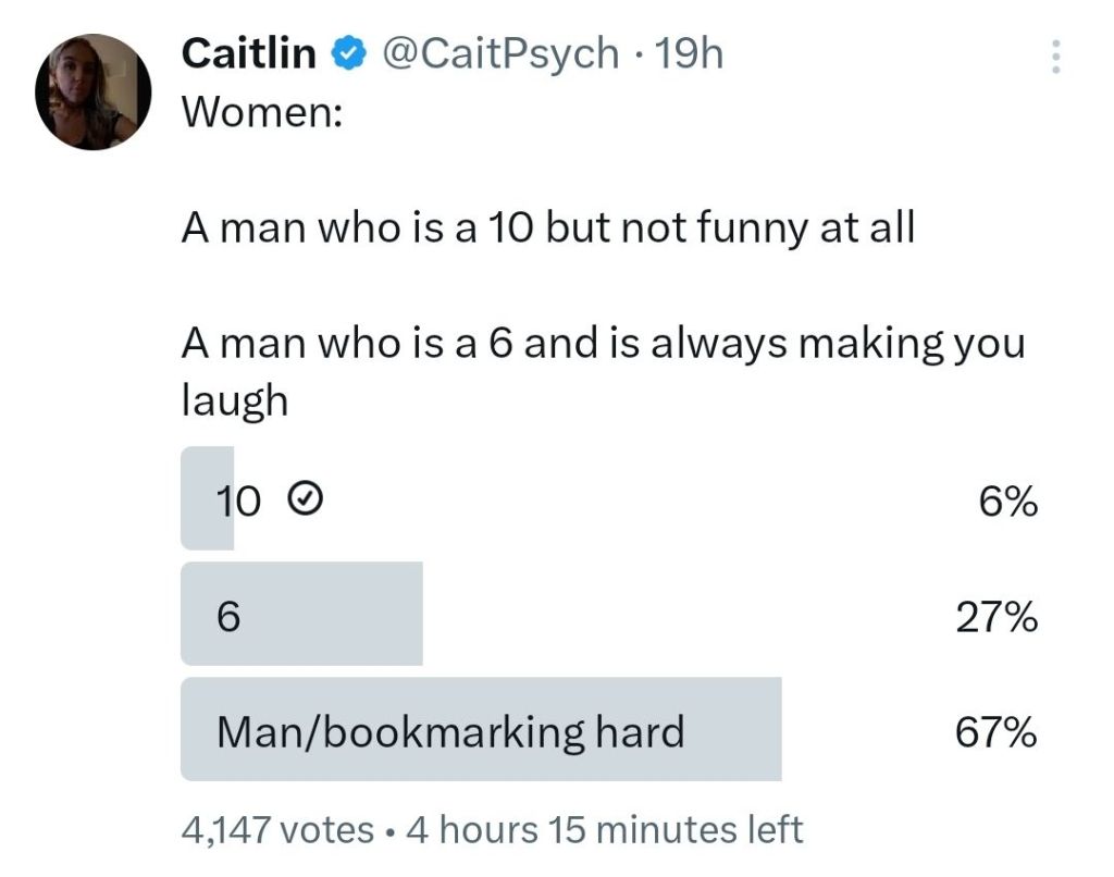 Or maybe I’m too literal and this “making you laugh” isn’t about actual jokes. Maybe it comes from women who didn’t end up with the kind of guy they secretly desire and they are consoling themselves that their sixty-percenter is not that bad.