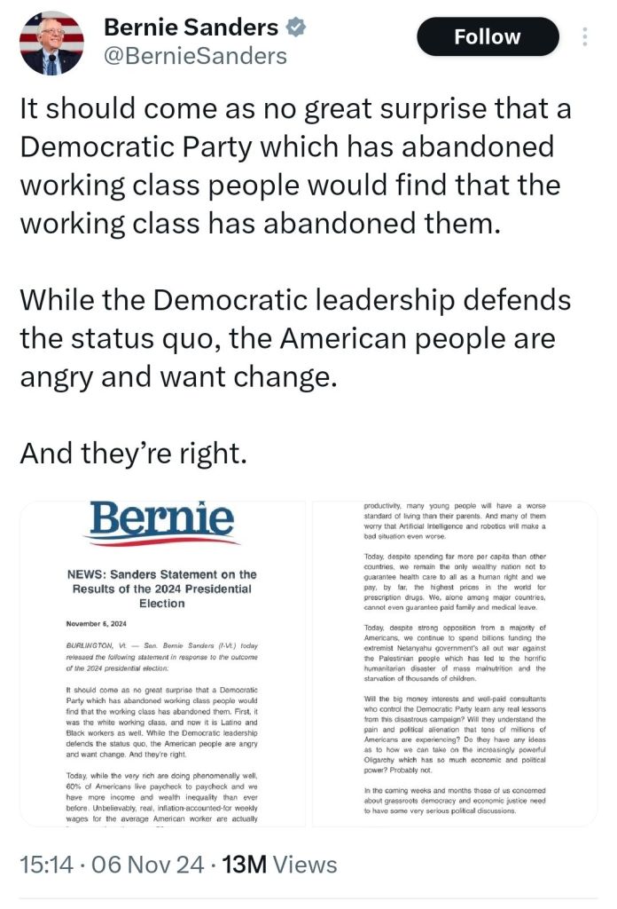 1. At least, he’s not saying that the Harris campaign was flawless and the loss is a result of Americans being racist-sexist, which is the current narrative of the rest of the Dems. Bernie’s statement is quite refreshing given that the rest of the party isn’t showing any signs of being willing to assume responsibility.