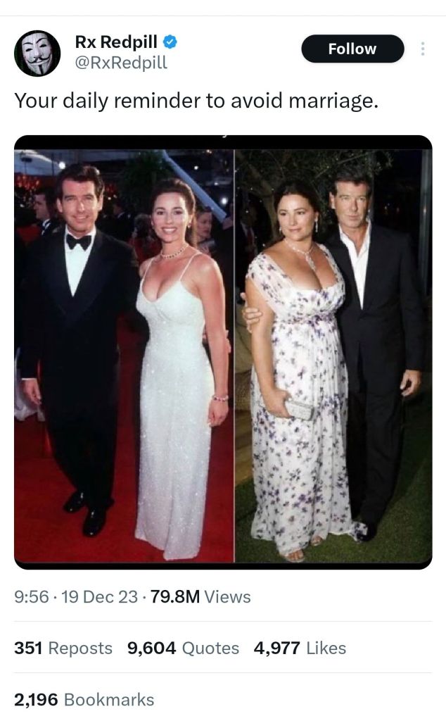 Marriage is a life extender for men OR men who tend to live longer are usually married, as a rule. Chicken or egg? There’s some interesting observations with red pillers but I’m convinced it’s a logical extension of the psy-ops that straight men want to be married less than women and women chase them down. “No, you don’t want to be married, you want to be single forever (and stop competing with other men for women, or noticing you’re not functional or financially stable enough to be married even if you wanted to)!” *wink*