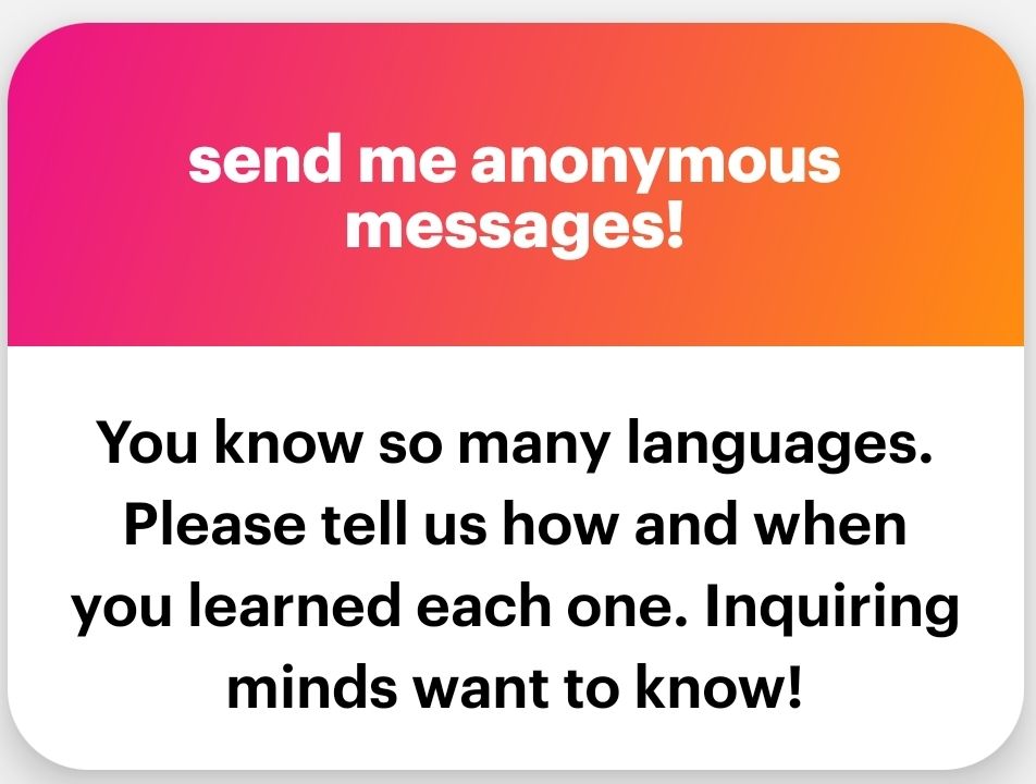 I learned to read and write in English before any other language. I could do beautiful English cursive by the age of five because we had this old textbook from back in the 1950s, and it paid a lot of attention to English cursive. Also, my father taught me about syntaxis and morphology by age four. Really, he did. We would play this game where he’d write a long sentence in English and I’d analyze its structure and underline different parts of the sentence with different types of lines. We also played lexemes and built trees of word families.