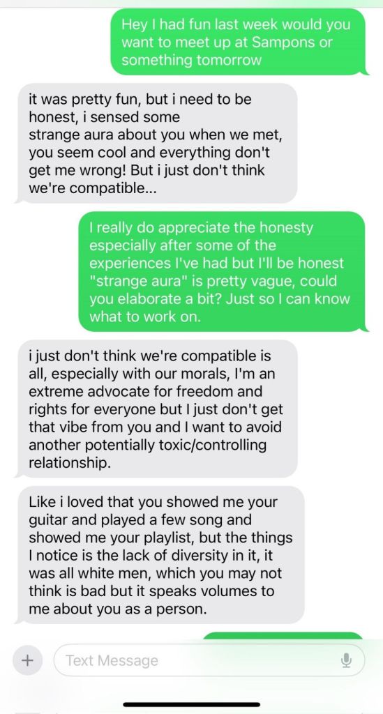 Would it be weird or as offensive if she had said, “It looks like we have very different values?” Because that’s a valid reason to not continue seeing a person and to not waste their time.