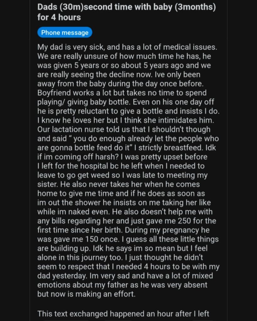 OK, it’s long, but the lowdown is that a young mother is upset that her boyfriend spends no time with their baby and isn’t participating in raising her.