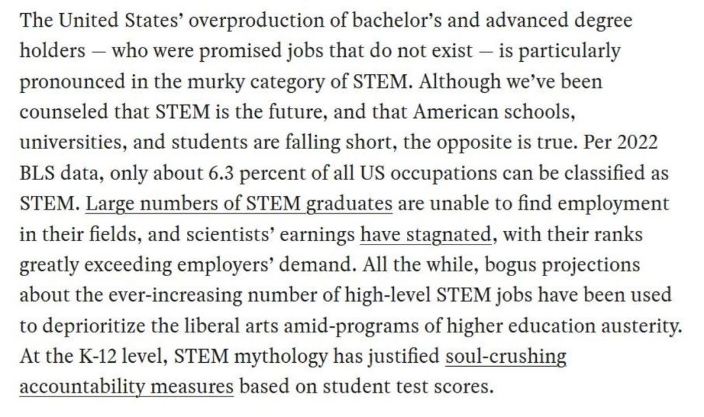 In reality, it’s not STEM vs Humanities. It’s bloody Psychology – a completely fake degree that its own faculty openly refer to as “fluff” – that’s destroying higher ed. Half of the incoming Freshman class goes into psychology, and then everybody who flunks out of actual disciplines joins them there. There are no jobs for a BA in psychology because the degree doesn’t let you see patients or offer counseling.
