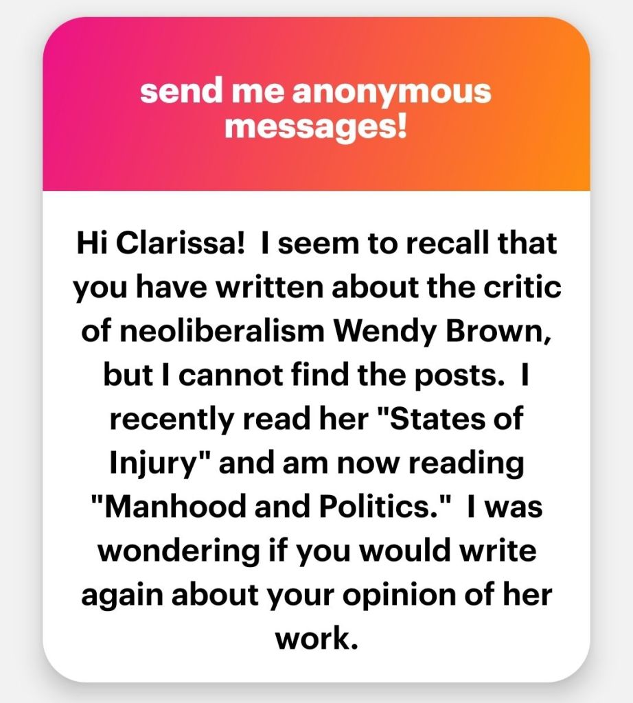 1. Prof. Clarissa, thanks for answering my question.  I was expecting to like Brown’s discourse but didn’t.  I had thought that I had read you favorably contrasting her thought to that of her wife Judith Butler, but maybe it was some other prof’s blog that I follow, I can’t remember.  Anyway, I’ve only read her very early work so far, and she’s said nothing about open borders there, so that must be in subsequent books.  I thought that her critique of victim consciousness in “States of Injury” was promising, particularly her critique of Catharine MacKinnon’s all-incompassing j’accuse against heterosexuality, but it seemed to me that Brown lost her own insight later in the book when she started using “male” as a rough synonym for “Satan.”  That problem is even worse in “Manhood and Politics,” where I find her reading of Aristotle’s “Politics” tendentious in the extreme.