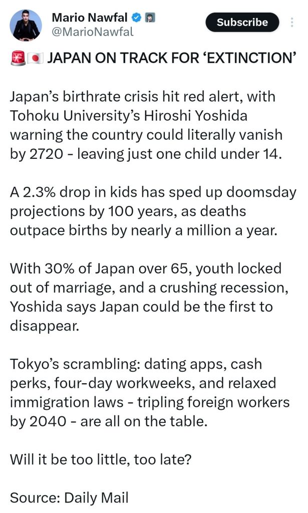 “Birthrate Apocalypse” is the Right’s global warming. At least, the Right is smarter in putting the date of the extinction 300 years from now. But it’s dumber in expecting people to care an about “vanishing countries” in 2720.
