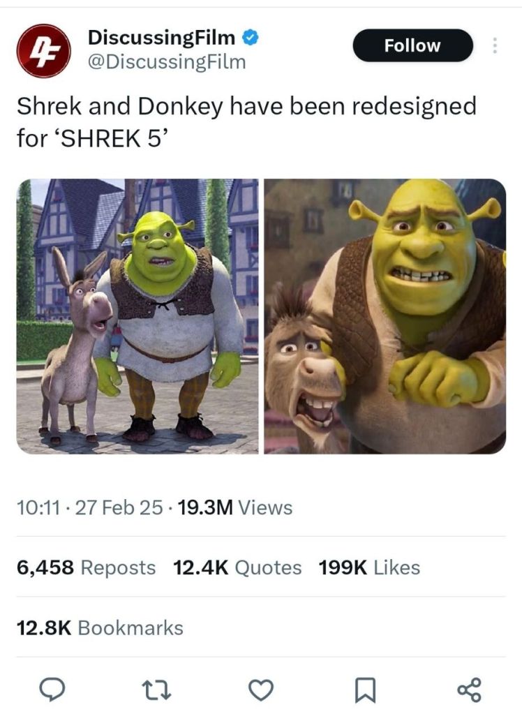 These pictures don’t show it well, but I remember seeing pictures of new Shrek and it just feeling *off.* Even here I can tell they’ve done something odd to his nose.