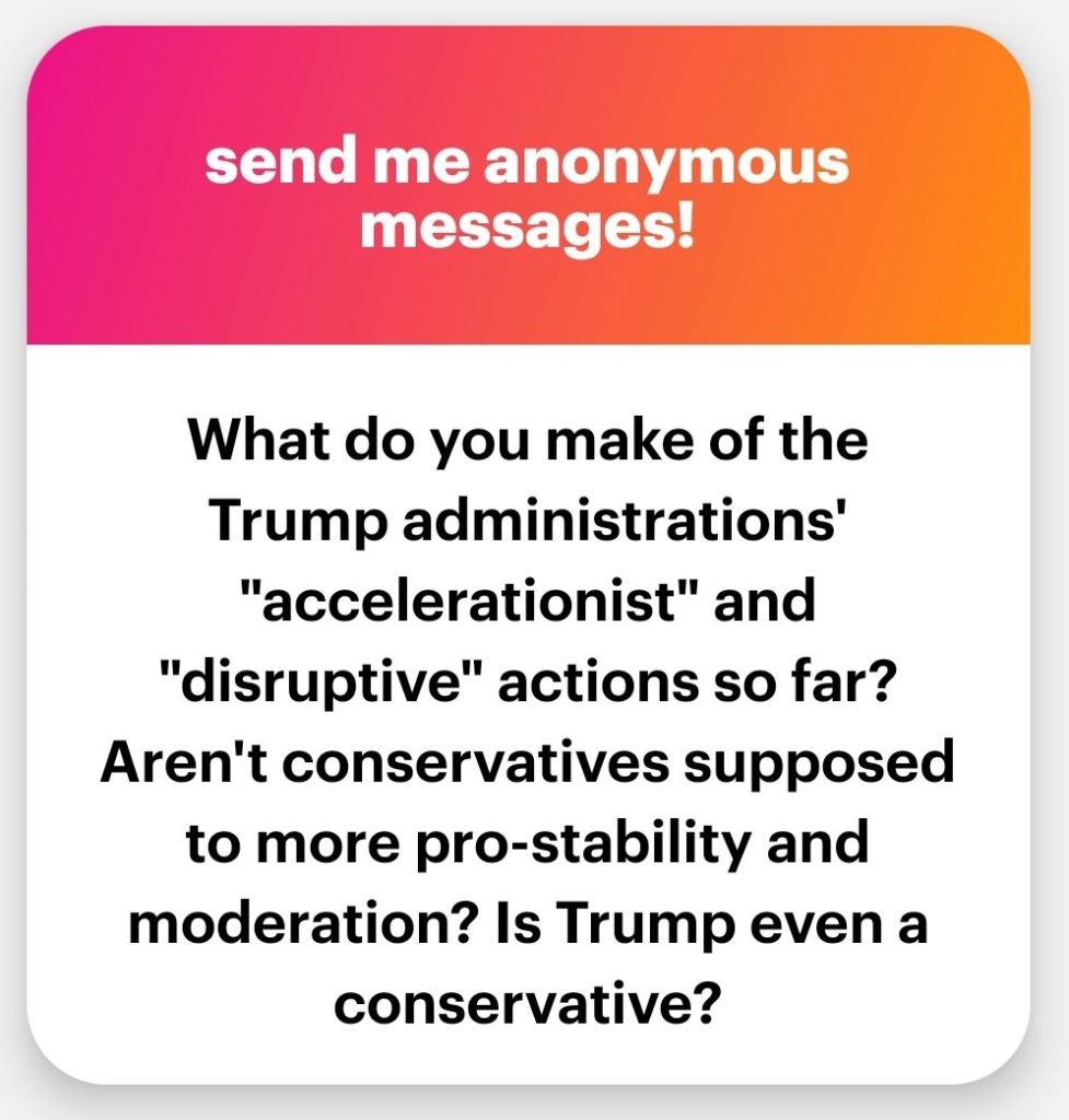One thing that struck me is there seems to be an inherent contradiction between conservatism and the idea that we need disruptive change to fix society. It almost seems that at that point the word “conservatism” loses its meaning entirely.