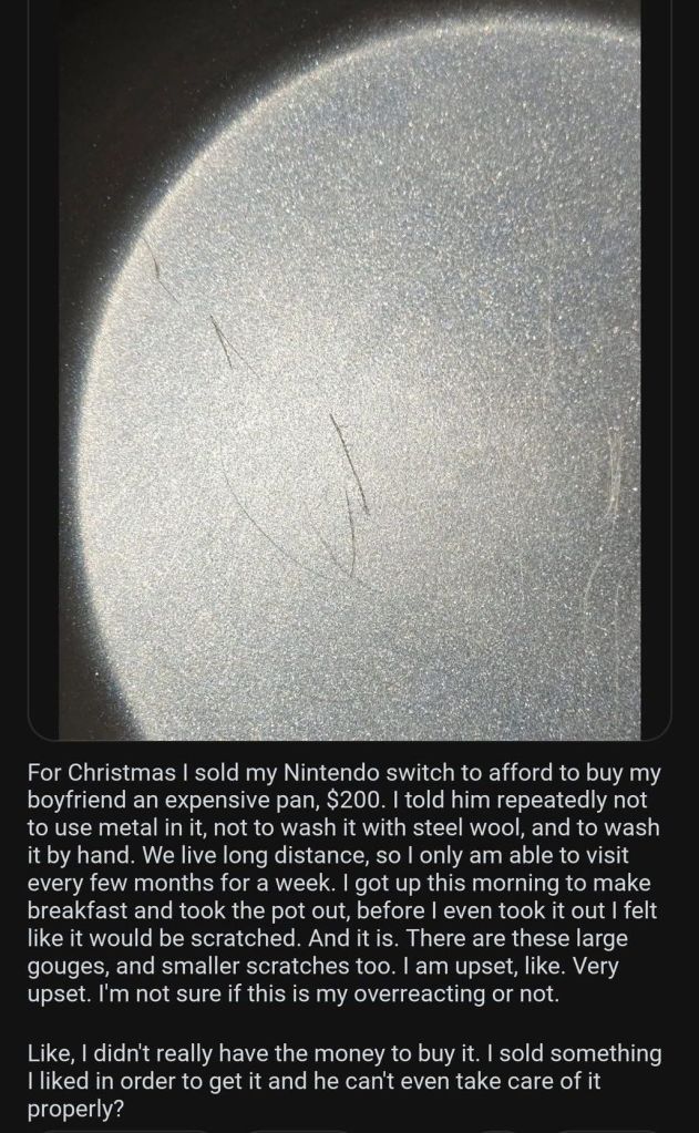 So what exactly is the problem with a few insignificant scratches on the bottom of a cooking pan (or pot, whatever)? They’re simply proof that the boyfriend actually USED the utensil, instead of simply sticking it in a cabinet and forgetting about it (which is what happens with a LOT of heartfelt, well-intended gifts). The girlfriend should be HAPPY about that!